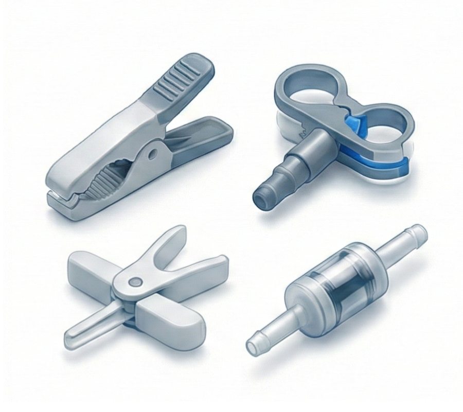 Flow control solutions including pinch clamps, roller clamps, and check valves.