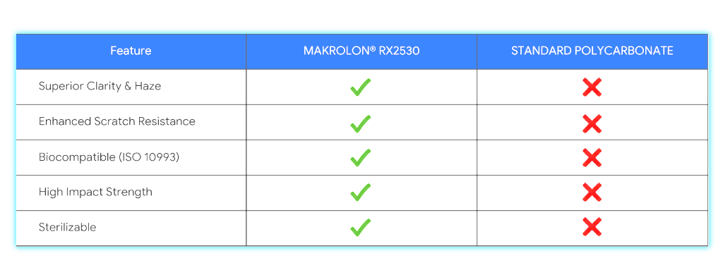 Welcome to the next generation of polycarbonate. Makrolon® RX2530 is a medical-grade material engineered for exceptional optical clarity, enhanced scratch resistance, superior light transmission, and superior durability. It’s designed to meet the rigorous demands of advanced medical and optical applications.